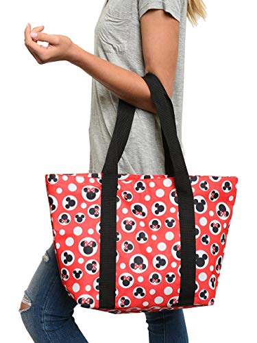 Disney travel totes made of polyester canvas – officially licensed. Polka dot print with Mickey and Minnie Mouse icons. Top zip closure, inner zip pocket and double shoulder straps. Tote bag is sized for the Amusement Parks, beach, travel, shopping and everyday use.