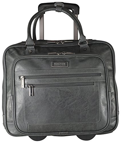 Kenneth Cole Reaction double compartment pebbled faux leather 2-wheel 16-inch laptop business tote / overnighter carry-on suitcase. Holds most laptops with up to 16” screen. Compatible with most tablets. Includes removable zippered accessory pouch. Convenient, easy accessible dual front exterior zipper pockets and gusseted zip down pocket with an organizer to hold A variety of business essentials. Front compartment includes two open pockets, a removable accessory pouch, a padded tablet pocket, and padded computer pocket. Rear compartment, also known as the overnight section, include garment restraints and two elastic open top shoe / accessory pockets. Rear exterior includes a trolley strap to fit over most upright handles for hands free carrying. Overall Size: 16.0” W x 14.0” H x 8.5” D. Computer Compartment Dimensions: 15.25” W x 10.5” H x 1.5” D. Weight: 6.5 lbs. Backed by a manufacturer 10-year limited warranty.
