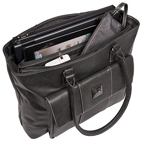 An all-in-one, day-to-night, pebbled faux leather single compartment 16” laptop tote, perfect for a day at the office, or a day spent running around town. The chic, pebbled leather-like pu Exterior body material is complete with a fully lined interior and self-repairing zippers designed for long lasting use. The main compartment is divided by a full-length zippered tablet pocket, and the front wall of main compartment Consists of two padded open top accessory pockets and a removable, zippered accessory pouch. The back wall of the main compartment includes a padded computer pocket that holds most laptops with up to a 16-inch screen and is compatible with most tablets. More pockets can be found on the outside of the bag, where the front exterior flap over pocket with a hidden magnetic closure Includes an organizer with a zipper pocket, phone pocket, open top PDA pocket, three card slots, and two pen loops. The bag’s rear exterior also features an easy access Open top pocket for storing additional items. Comfortable tote style handles can be worn over the shoulder and have a drop length of inches. A great tote that allows you to seamlessly transition from day to night. Overall size: size: 17. 0” L x 13. 0” H x 6. 25” D. Computer compartment Dimensions: 15. 25” L x 10. 3”H x 1. 5” D. Weight: 3. 1 lbs. Backed by a manufacturer lifetime limited .