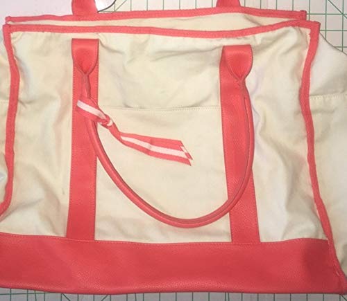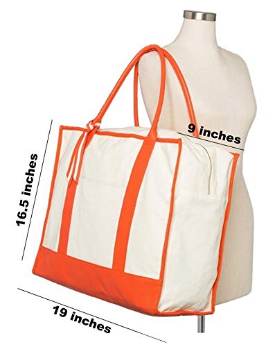 Weekender Bag, Large Expandable, Canvas Buff White Coral Orange. Overnight Travel Carry On Shoulder Duffle Tote Bag. 16.5 inches (H) x 19 inches (W) x 9 inches (D) Nice Big Purse Dimensions (Overall): 16.5 inches (H) x 19 inches (W) x 9 inches (D) Weight: 20 ounces Holds up to: 10 kilograms Main Compartment Closure:: Zip Closure Shell Material:: Canvas Placement: Carry on Handle Material: PU Leather Exterior Features: Hanging Bag Care and Cleaning: Spot or wipe clean Number of Wheels: No wheels Interior Features: Interior zip pocket, Interior cell phone pocket Handle Type: Double Handle Bag structure: Structured