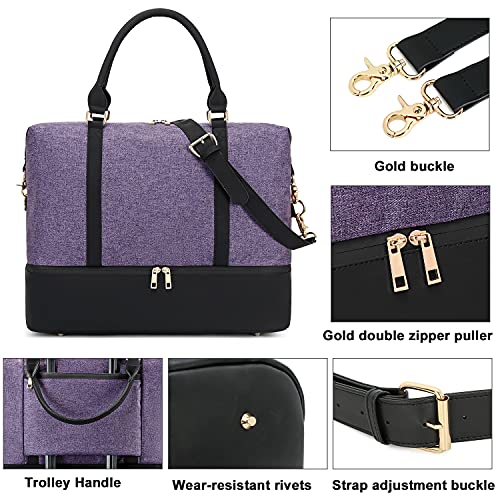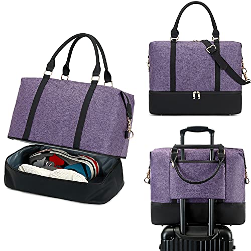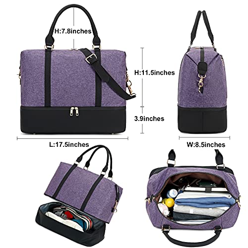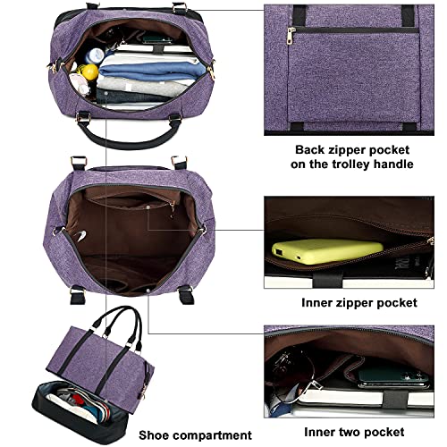 Womens Travel Weekend Bag Canvas Overnight Carry on Shoulder Duffel Beach Tote Bag (Purple with shoe comparment)