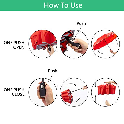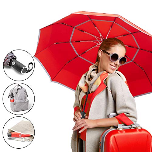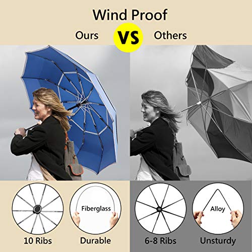 ☔ WINDPROOF & AUTO OPEN – Heavy Duty Made to Withstand Strong Winds & Heavy Rains with 10 Reinforced Fiberglass Ribs & Double Canopy Design – Strong Durability that Prevents Overturning. Auto Open/Close Push Design that Opens Effortlessly with just a Button. Other Umbrellas flip in the wind & break immediately, but not the Durable HOSA Travel Umbrella! Made with a Vented Double Canopy, this umbrella allows the wind to pass through, minimizing the risk of flipping over & breaking in strong winds!